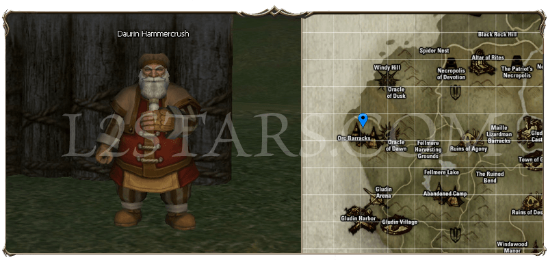 6. Телепортируйемся в Gludin Village Телепортируемся в Orc Barracks Ищем Daurin Hammercrush После разговора с гномов, будут призваны Ящерицы. После убийства которых вы получите 1st Secret Letter Снова разговариваем с гномом.