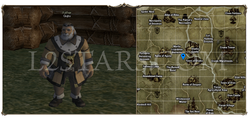 4. Телепортируемся в Town of Gludio Бежим из города в сторону Ruins of Agony. Ищем ранчо и рядом с домом стоит гном Gupu Выбирайте любой вариант (1 вариант заплатить 100 000 аден, 2 вариант ни чего не платить) еще раз поговорите с ним.