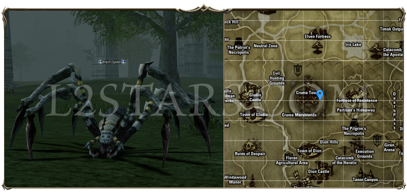12. Телепортируемся в Town of Dion. Телепортируемся в Cruma Tower. Вокруг башни охотимся на Marsh Spider (Болотный Паук 34 ур.), пока не получим