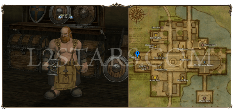 4. Телепортируемся в Giran Castle Town. Бежим в кузницу и ищем кузнеца Blacksmith Pushkin. Он вам передаст