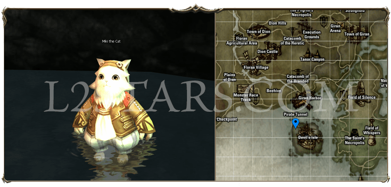 3. До Miki можно доплыть с Доков Гирана, но заплыв в туннель, есть риск встретить мобов. Преодолев туннель мы встретим кота. Он нам и нужен, берем квест.