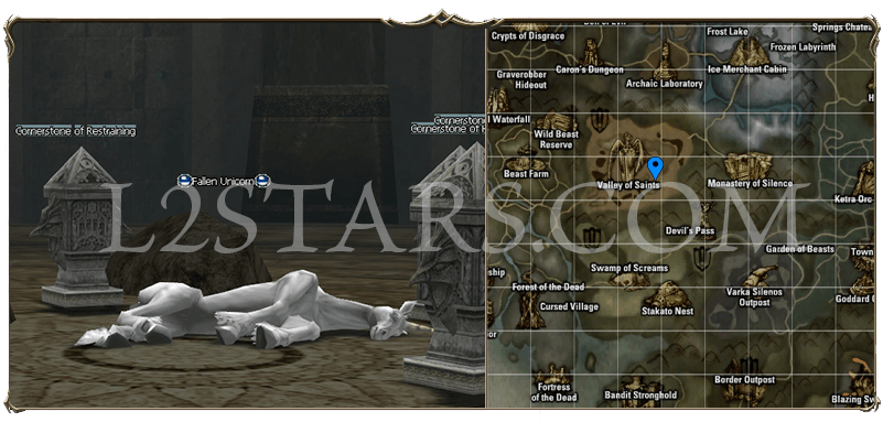 5. Телепортируемся в Valley of Saints. Ищем мертвого единорога Fallen Unicorn. Необходимо убить монстров, которые находятся рядом с единорогом пока не получим 4