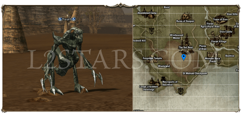 6. Телепортируемся в Town of Gludio (Город Глудио). Телепортируемся в The Ant Nest. Не спускаясь в муравейник бежим в центр пустыни. Охотимся на Tyrant (Тиран 36 ур.), пока не получим
