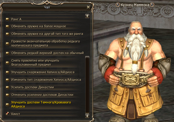 Кузнец Маммона перемещается только по катакомбам. Абсолютно таким же способом, как и Торговец, - каждые полчаса случайным образом телепортируется в одни из катакомб. Услуги Кузнеца следующие: