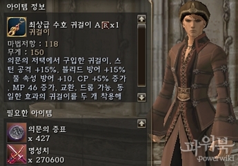| Макс. HP/MP/CP +500, лимит веса +12000, Скор. Восстановления HP +10.12, Скор. Восстановления MP +3,89, Физ. Атк./Маг. Атк./Физ. Защ./Маг. Защ. +6%, сопротивление отражению урона +5, +36 ячеек инвентаря, защита от всех стихий +10. | Макс. HP/MP/CP +1000, лимит веса +25600, наносимый урон +8%, получаемый урон -9%, сопротивление отражению урона +5%, ячейки инвентаря +36, защита от стихий +15. | |
