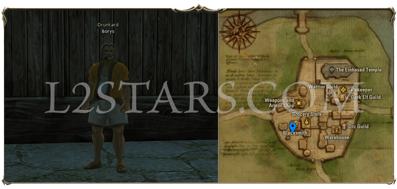 6. Телепортируйемся в Town of Gludio, за кузнице ищем и разговариваем с DrunkardBorys Он вам передаст
