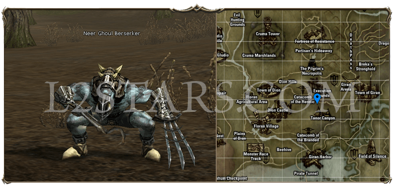 3. Если сейчас у вас на сервере неделя победы в борьбе 7 печатей, то вы сможете телепортироваться в Execution Grounds (Земля Казненных). Если нет, то бежим пешком. Поднимаемся по лестнице наверх и охотимся на Neer Ghoul Berserker (Вурдалак Берсерк 29 ур.) Охотимся на них пока не получим Mysterious Spirit Ore (Камень Вурдалаков). После получения необходимого предмета, возвращаемся к Terry в гильдии воинов в Town of Dion.