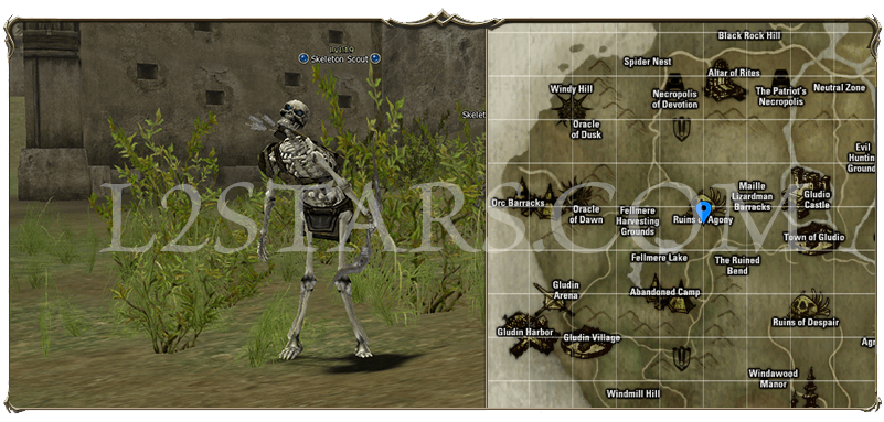 7. Телепортируемся в Town of Gludio (Город Глудио). Телепортируемся в Ruins of Agony (Руины Страданий). Охотимся на Skeleton Scout (Скелет Разведчик 19 ур.), пока не получите