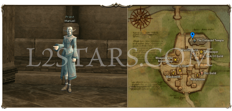 1. Квест Path of the Elven Oracle начинается в Town of Gludio (Город Глудио). В храме ищем Priest Manuel (Мануэль) и берем у него квест.