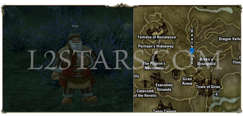 7. Телепортируемся в Town of Gludio (Город Глудио) -> Giran Castle Town (Город Гиран) -> Dragon Valley (Долина Смерти. Там возле дороги ищем Torai (Торай). Возвращаемся в Gludin Village к Raut, он передаст вам