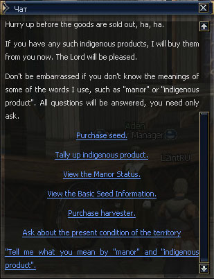 | Диалоговое окно с Манор менеджером Purchase seed - Покупка семян Tally up indigenous - Сдача урожая View the Manor Status - Настройки продажи семян и скупки урожая View the Basic Seed Information - Общая информация о маноре Purchase harvester - Купить харвестер | ![]() |