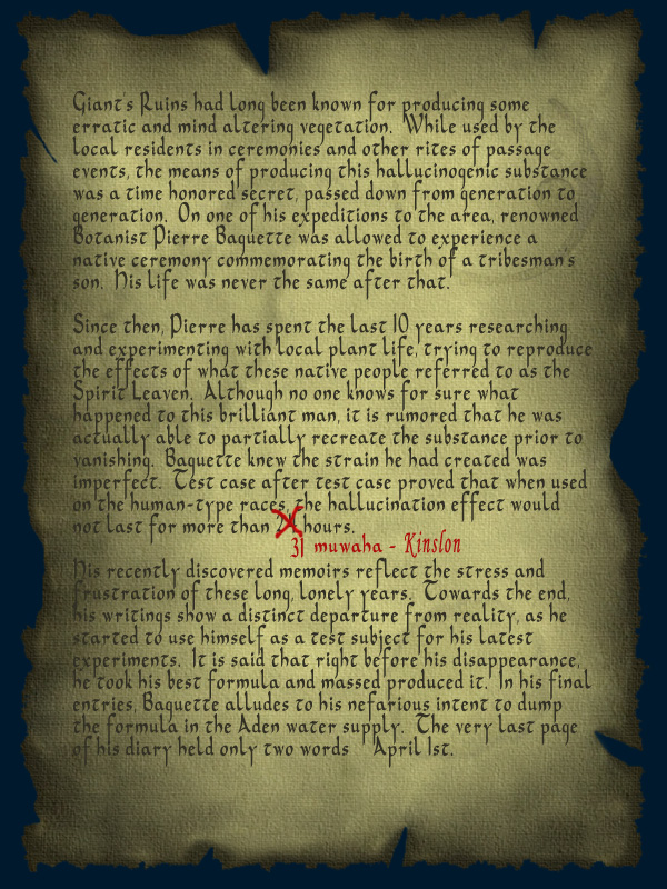 Giant's Ruins had long been known for producing some erratic and mind altering vegitation. While used by the local residents in ceremonies and other rigts of passage events, the means of producing this hallucinogenic substance was a time honored secret, passed down from generation to generation. On one of his exepeditions to the area, renowned Botanist Dierre Baquette was allowed to experience a native ceremony commemorating the birth of a tribesmans's son. His life was never the same after that.